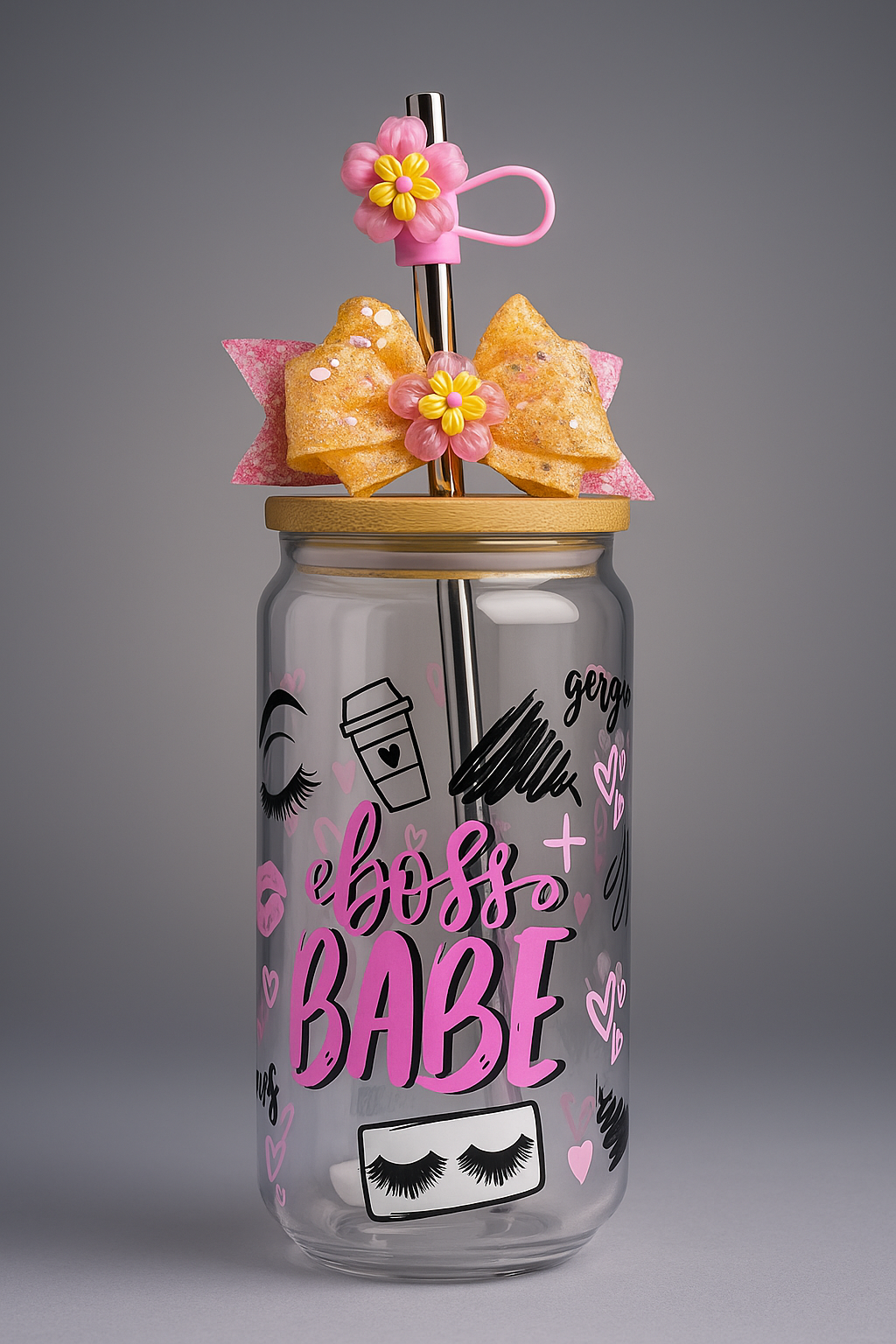 Look fabulous while staying hydrated in style! This charming glass with a golden lid and metallic straw is not only functional but also a true statement of attitude! Decorated with fun beauty graphics and the powerful phrase "Boss Babe," it's perfect for empowered girls who love cute and chic. 💄💋